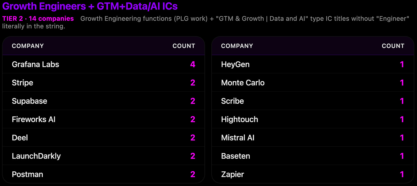 If we add in Growth Engineers (Stripe, Supabase, Grafana Labs, HeyGen, Figma, Monte Carlo, Postman, Scribe) and the Hightouch/Fireworks-style “GTM & Growth | Data and AI” ICs where the word “engineer” doesn’t appear in the title, but the work obviously is, it adds another 14 companies (we’ll call these “Tier 2”), and brings the total to 34 companies.