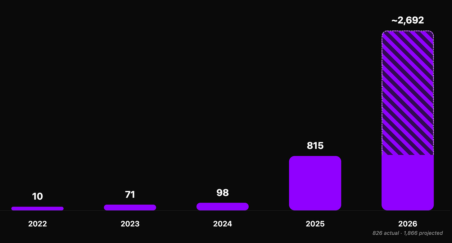 *Note: 2026 projection is 826 postings through day 112 of 365, linearly extrapolated to a full-year run-rate of ~2,692. Actual full-year total will vary with hiring seasonality.