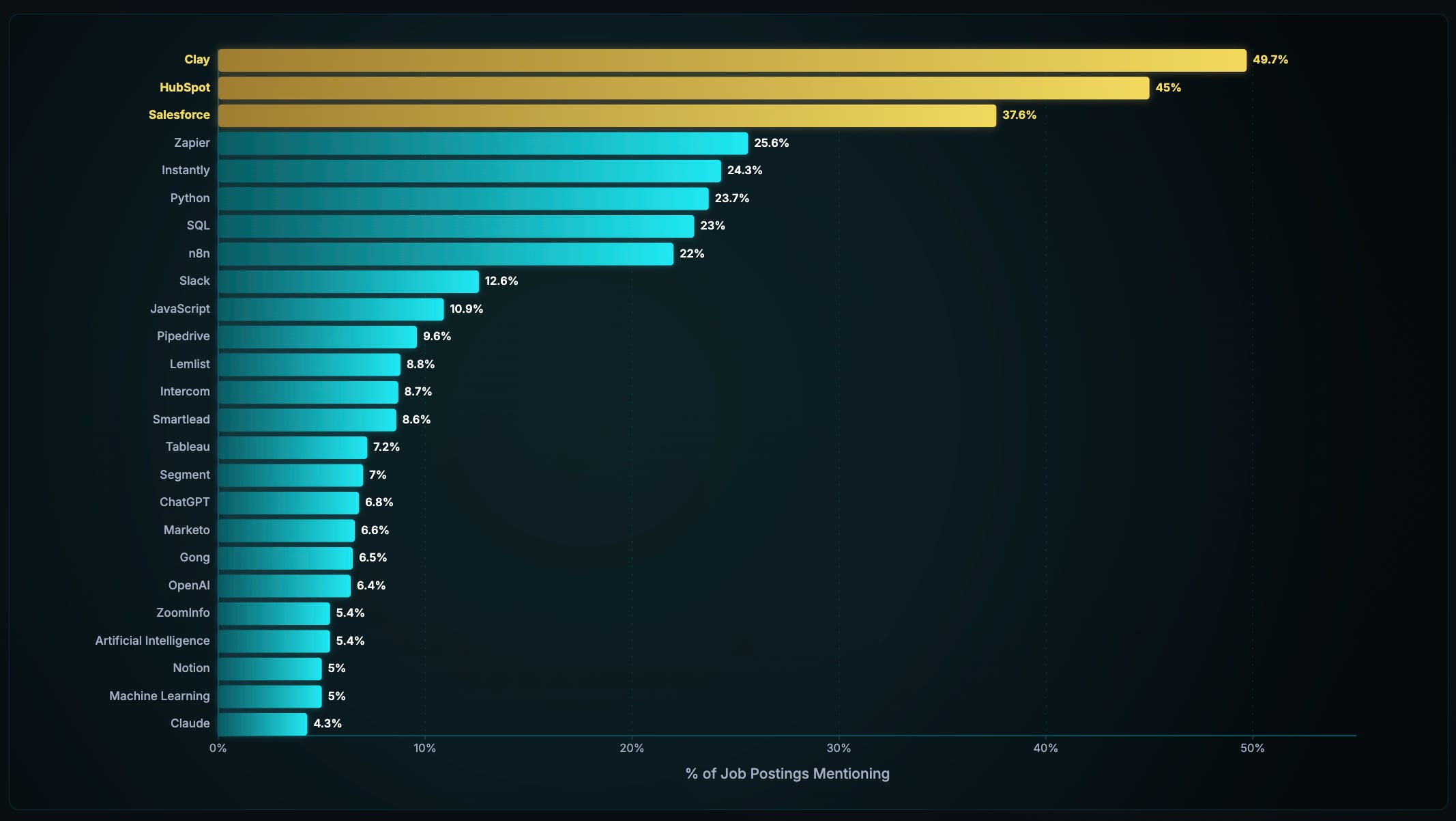 Here are the most frequently mentioned tools and technologies in GTME job listings: