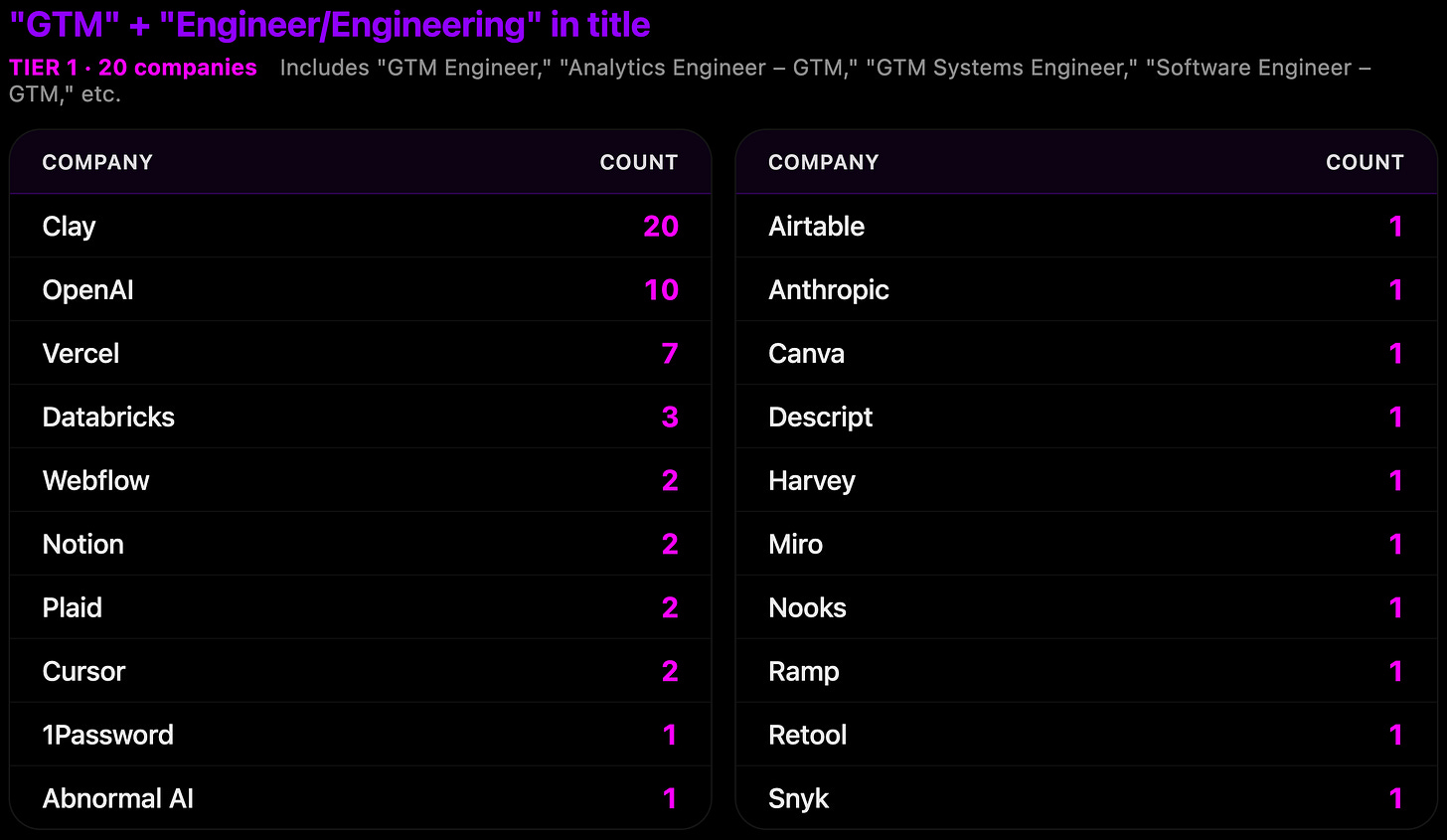 When I dropped the strict title match and looked at any combination of “GTM” plus “engineer” or “engineering” (regardless of phrasing), the picture changed completely. Shout-out to Sumble, inside Claude Code, for helping me wrangle this data.