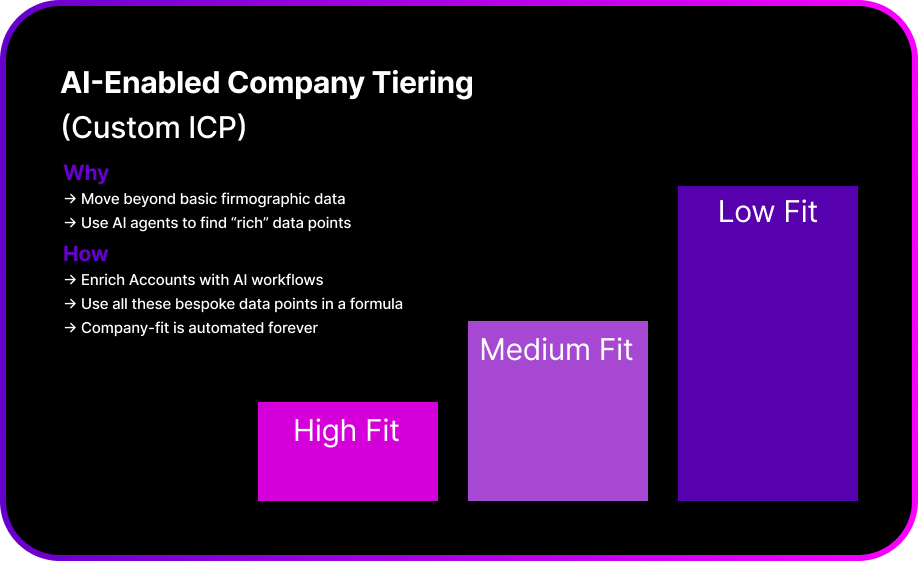Build an AI workflow so that every person at a company is found, with their title, and tagged with a ‘Persona’ that is written back to your downstream systems (eg: CRM and data warehouse). You’ll use this persona for messaging (eg: ai prompts) and to determine the level of automation for certain plays. Also you can/should use these persona buckets for ABM, reporting, and attribution.