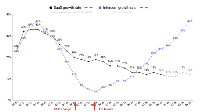 What’s most exciting to me, most energizing, is shining a light on the companies that are building the new playbook right now. These are companies that decide to reorg around becoming AI-native. When you look at Block (led by Jack Dorsey), Shopify (led by Toby), or Intercom/Fin.ai (led by Eoghan taking the reins again), it’s clear that even incumbents can—and have to—“re-found” themselves from first principles with the tools at our disposal today. I mean, my gosh, just look at this chart of Intercom: