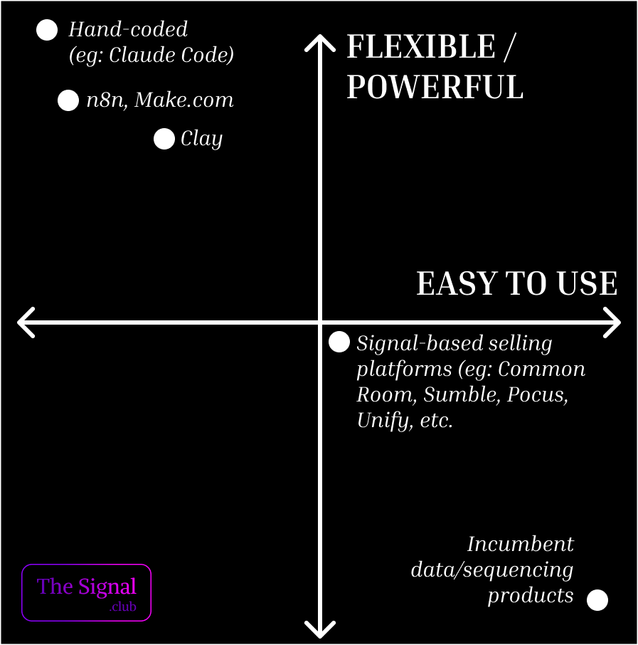 In the middle: Signal-based tools that productized signals/automation (think: person-level intent that’s much better than 6Sense/Demandbase). More powerful, but harder to use.