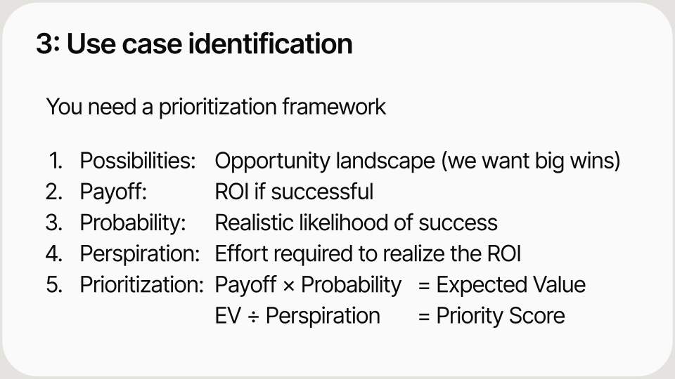1. Possibilities. What’s your opportunity landscape? Map all the ways AI could improve your biggest priorities.