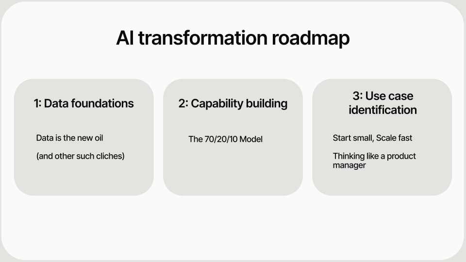 5. Cultural transformation > technical implementation. Spend at least as much time on driving adoption as on technical components. Spotlight what works. Slow-roll to the organization. Don’t deploy through a Slack announcement and wonder why nobody uses your cool AI stuff.
