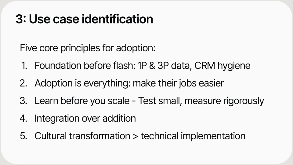1. Foundation before flash. Fix your 3P and 1P data. Ace CRM hygiene. Don’t worry about avatar-based sales or AI solution engineers until the foundations are solid.