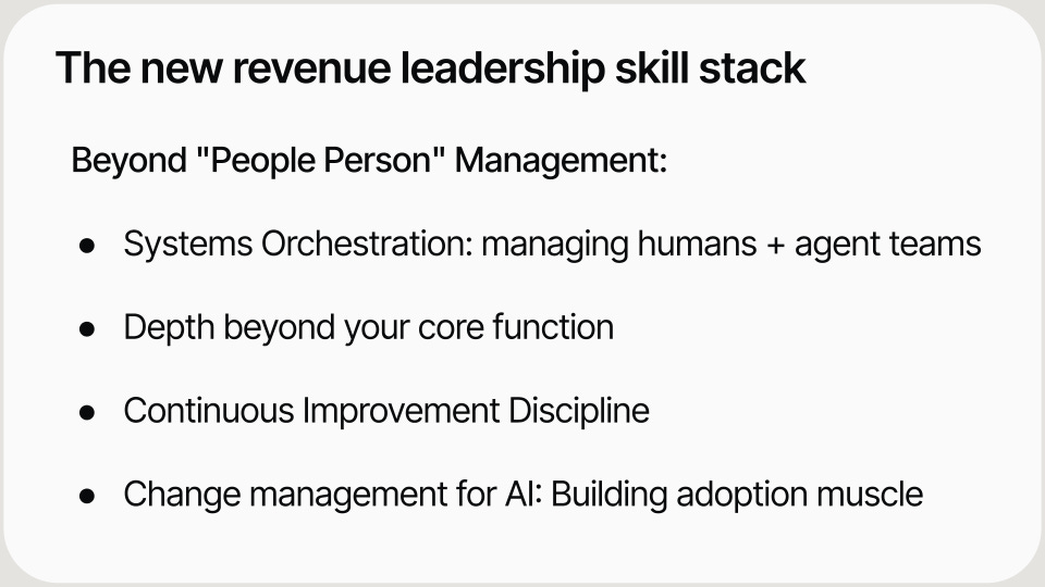 2. Depth beyond your core function. If you’re a sales leader, you can’t just think about sales. You need to understand implications into onboarding, growth, CS. Agents might work across these functions. The lines are blurring.