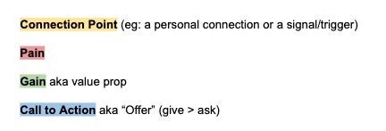 Clear pain → value. I have this problem, you solve it, here’s how. Again, think about this framework: Connection Point, Pain, Gain, CTA.