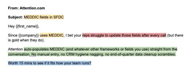 This one worked better because the signal is clear (MEDDIC usage). The pain is relatable (reps not updating fields). The value prop is specific (auto-populates from conversation). Again, tools like Attention (previous calls), Rox, and Sumble give you data that you can get creative with to build unique signals for your market.