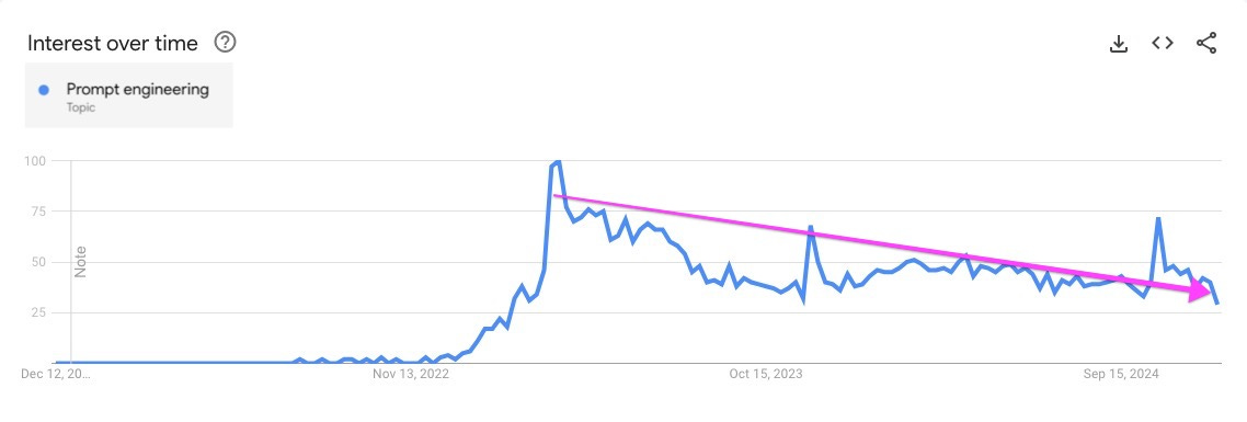 “Prompt engineering” was a hot term a few years ago—peaking two years ago, interestingly, and downward trend since then: