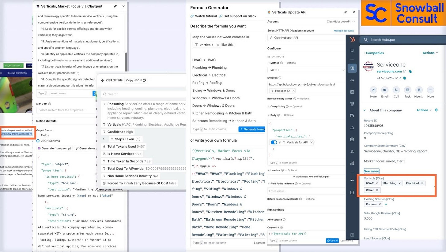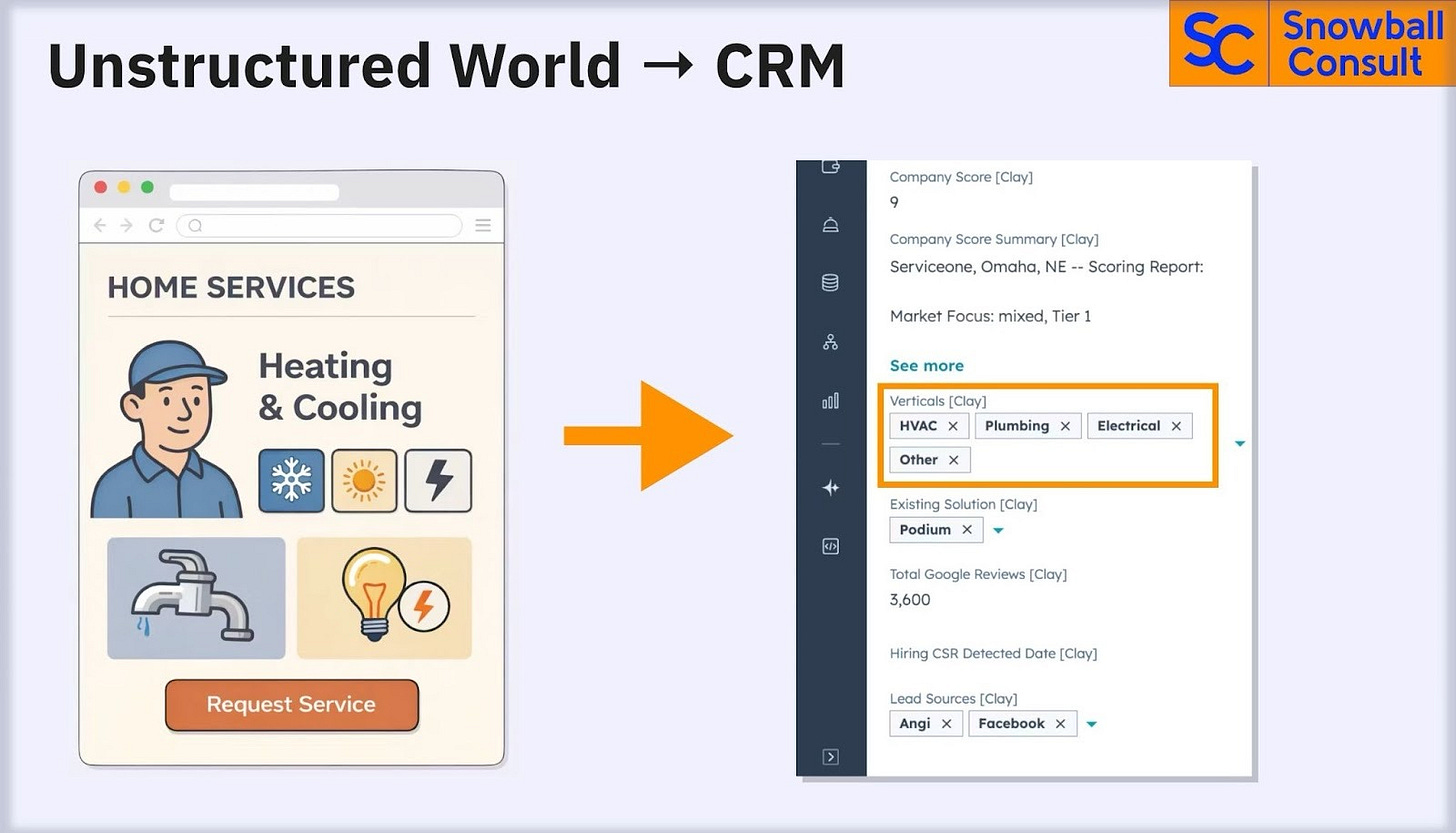 Andreas showed a simple example: a home services website with icons for heating, cooling, plumbing, and electrical. Unstructured. Messy. But when you run it through an agent, you get a HubSpot record with clean picklist values: HVAC, Plumbing, Electrical, Other. Plus a company score, a market focus classification, existing solutions detected, Google review count, hiring signals, and lead sources.