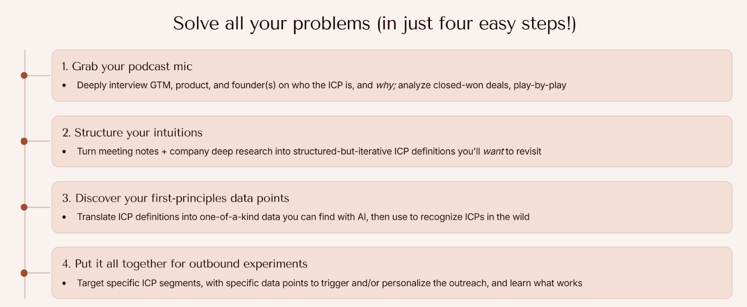 But your top sellers don’t think in firmographics. They think in patterns. When Matthew interviews GTM teams, he digs past the surface-level definitions. He asks about specific closed-won deals. Play by play. What happened in that first discovery call? Why did the prospect take the meeting? What had they experienced the week before that made the timing perfect?