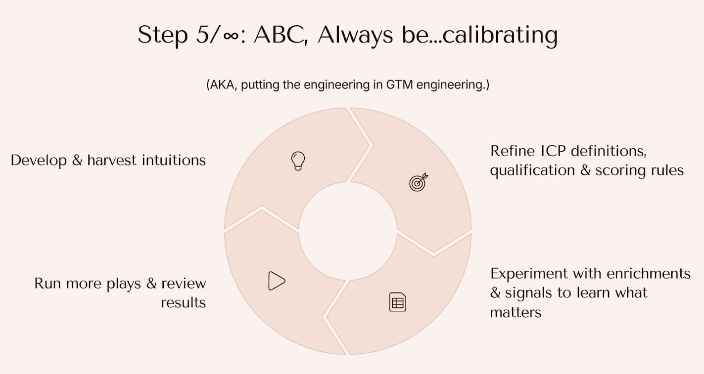 You build intuitions. You refine your ICP definitions. You experiment with enrichments to learn what actually matters. You run plays and review results. Then you go back to the beginning and harvest more intuitions based on what you learned.