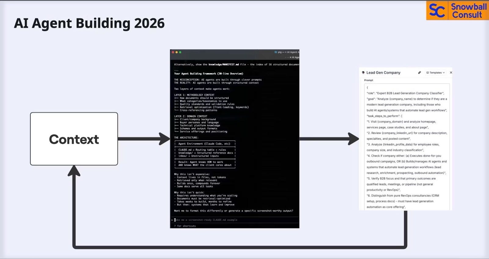 Andreas doesn’t write prompts from scratch anymore. He builds foundational documents first. Deep definitions of the concepts he’s trying to classify. Then he uses those documents as context when building agents in Claude Code, asking it to generate structured prompts following his framework.