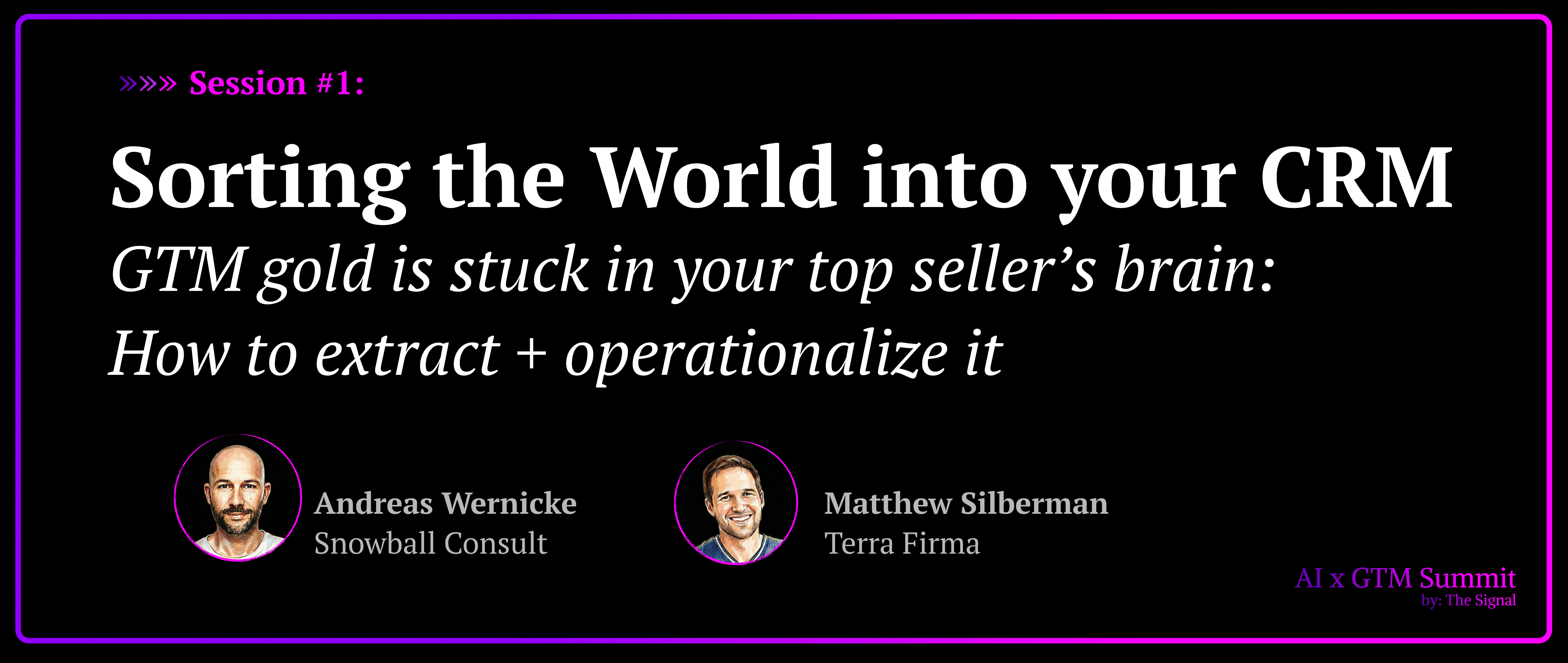 At the AI x GTM Summit, Matthew Silberman (founder of Terra Firma) and Andreas Wernicke (founder of Snowball Consult) laid out a practical roadmap for extracting the tacit knowledge trapped in your best sellers’ brains and how to turn it into scalable, repeatable GTM infrastructure.