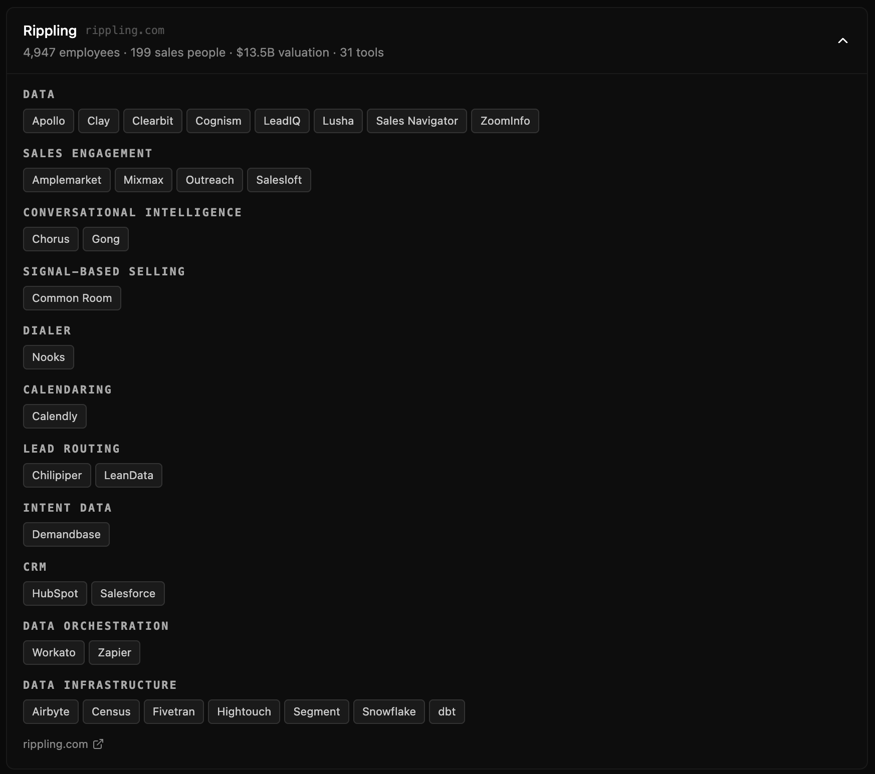 Rippling (31 tools, 4,947 employees, $13.5B valuation) has the largest GTM stack in the dataset. They run the full traditional stack (Salesforce, HubSpot, Gong, Outreach, Salesloft, ZoomInfo) alongside modern tools (Clay, Common Room, Amplemarket, Nooks). They also have deep data infrastructure (dbt, Snowflake, Fivetran, Airbyte, Census, Hightouch, Segment). This is what a mature, heavily-invested GTM org looks like.