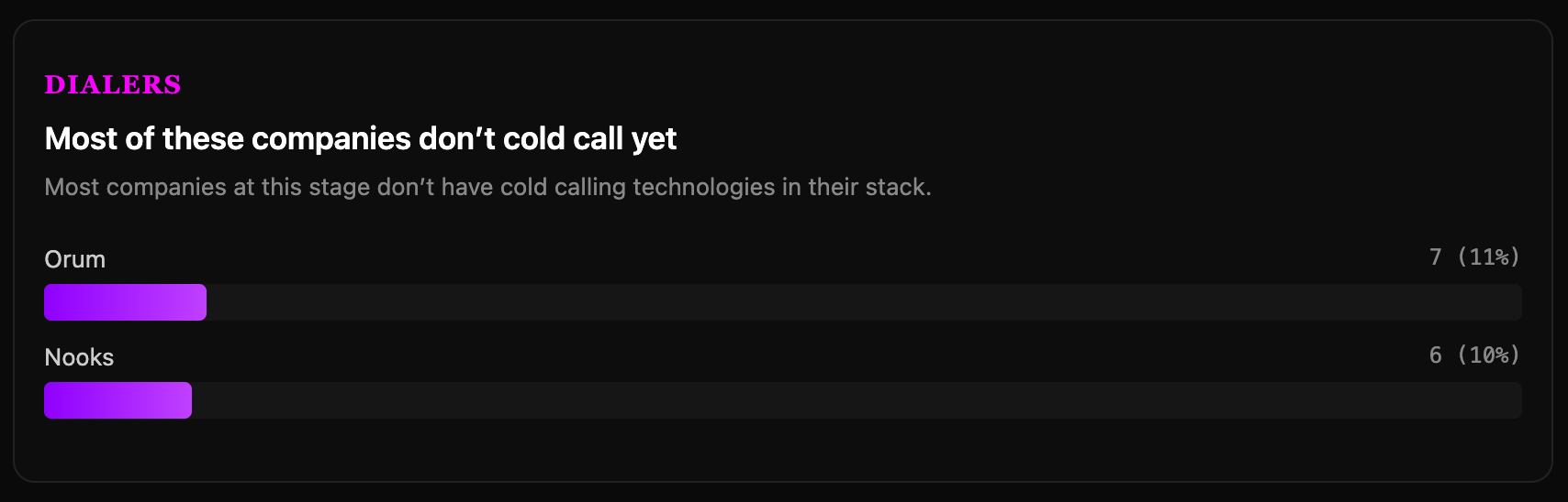 Orum shows up at 7 companies. Nooks at 6. The vast majority of these companies don’t have a dialer in their stack yet.