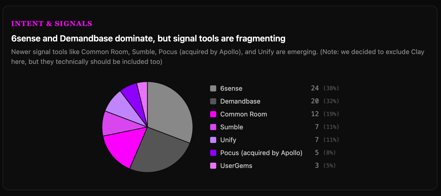 But a new class of signal tools is gaining traction. Common Room (19%), Sumble (11%), and Unify (11%) are showing real adoption at these companies. They’re smaller, lighter, and more tightly integrated into sales workflows than the traditional ABM platforms.