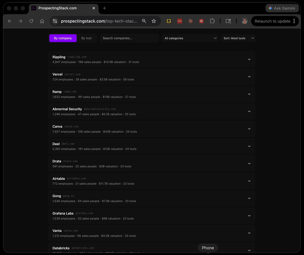 You can search by company, filter by category, sort by valuation, headcount, sales team size, or number of tools, and click into any company to see their full stack.