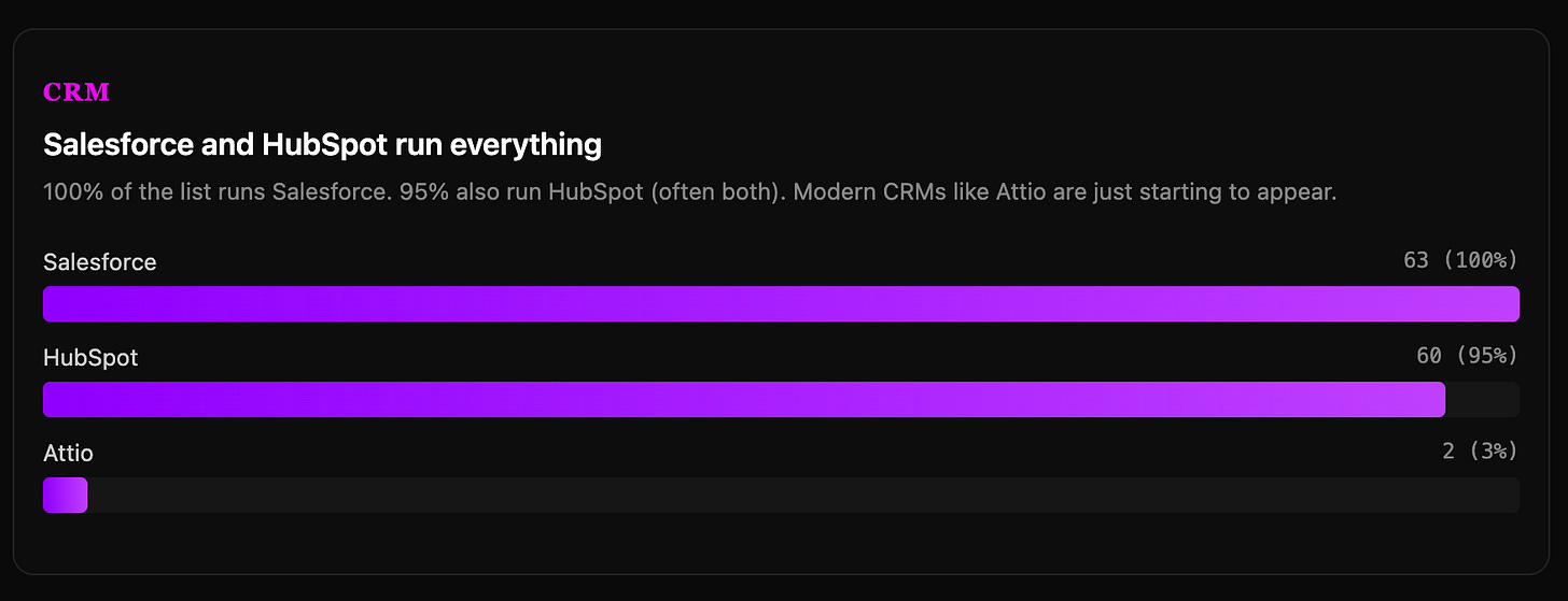 Every single company in this dataset runs Salesforce. 100%. HubSpot is right behind at 95%. Most run both (HubSpot for Marketing, in many cases).