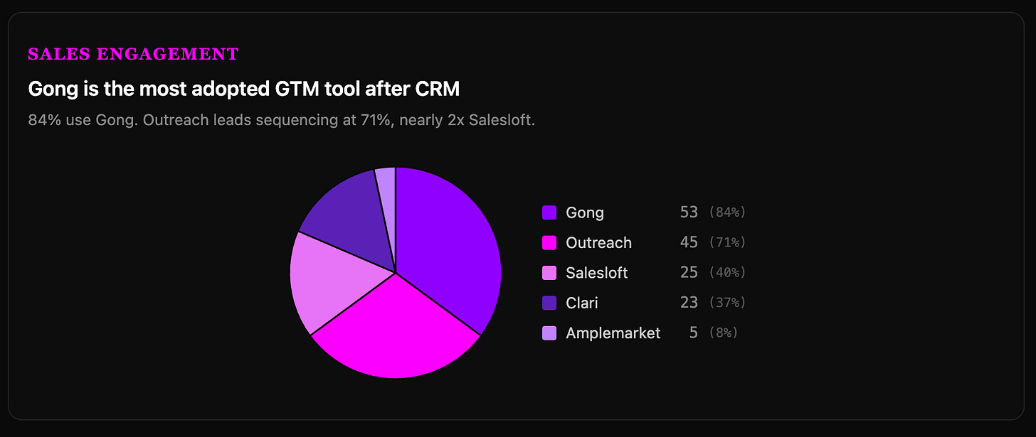 This one surprised me. Gong at 84% adoption is ahead of Outreach (71%) and well ahead of Salesloft (40%). Gong has become the default operating system for how these companies understand their customer conversations. Though more companies are starting to layer in Attention.com on top (or replacing Gong in some cases).