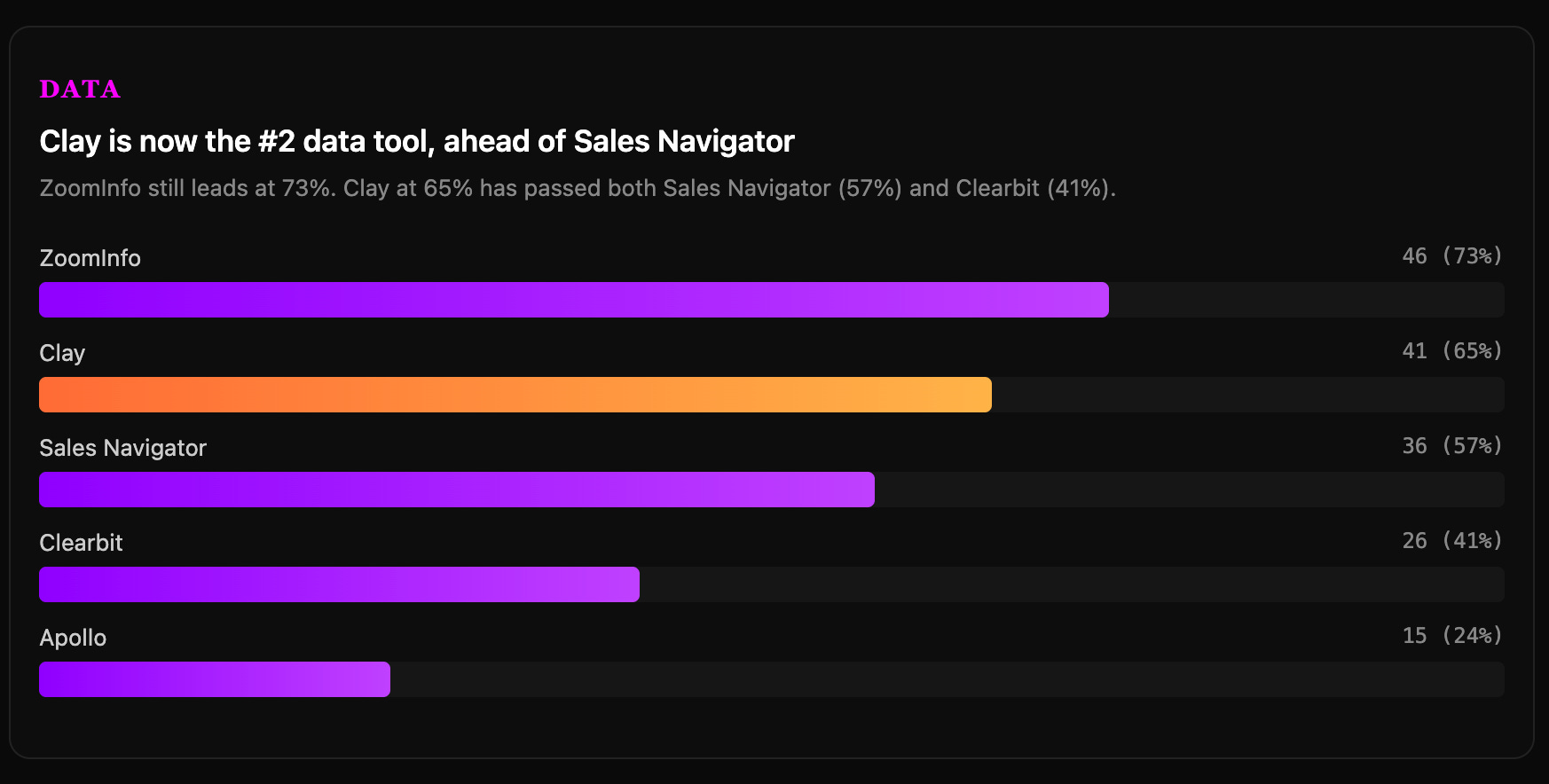 ZoomInfo still leads at 73%. But Clay is on their heels at 65%, ahead of Sales Navigator (57%), Clearbit (41%), and Apollo (24%).
